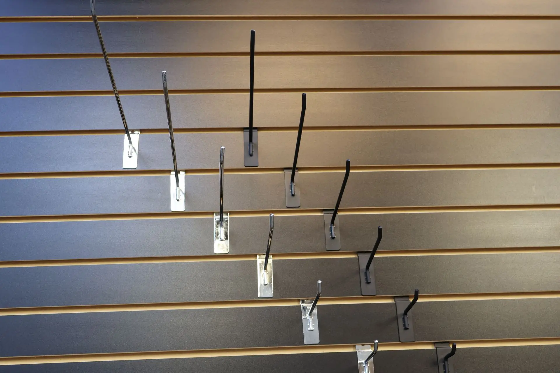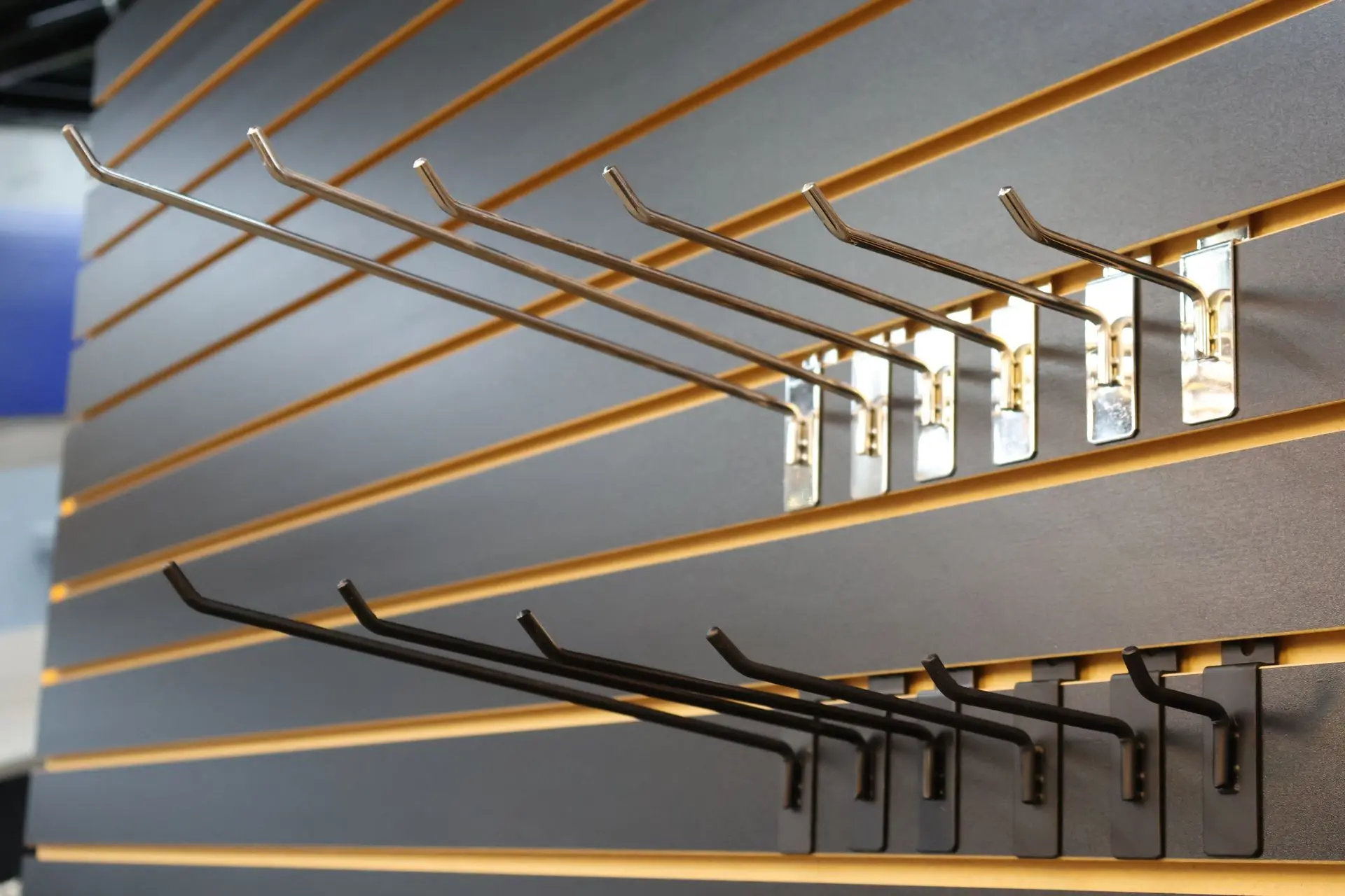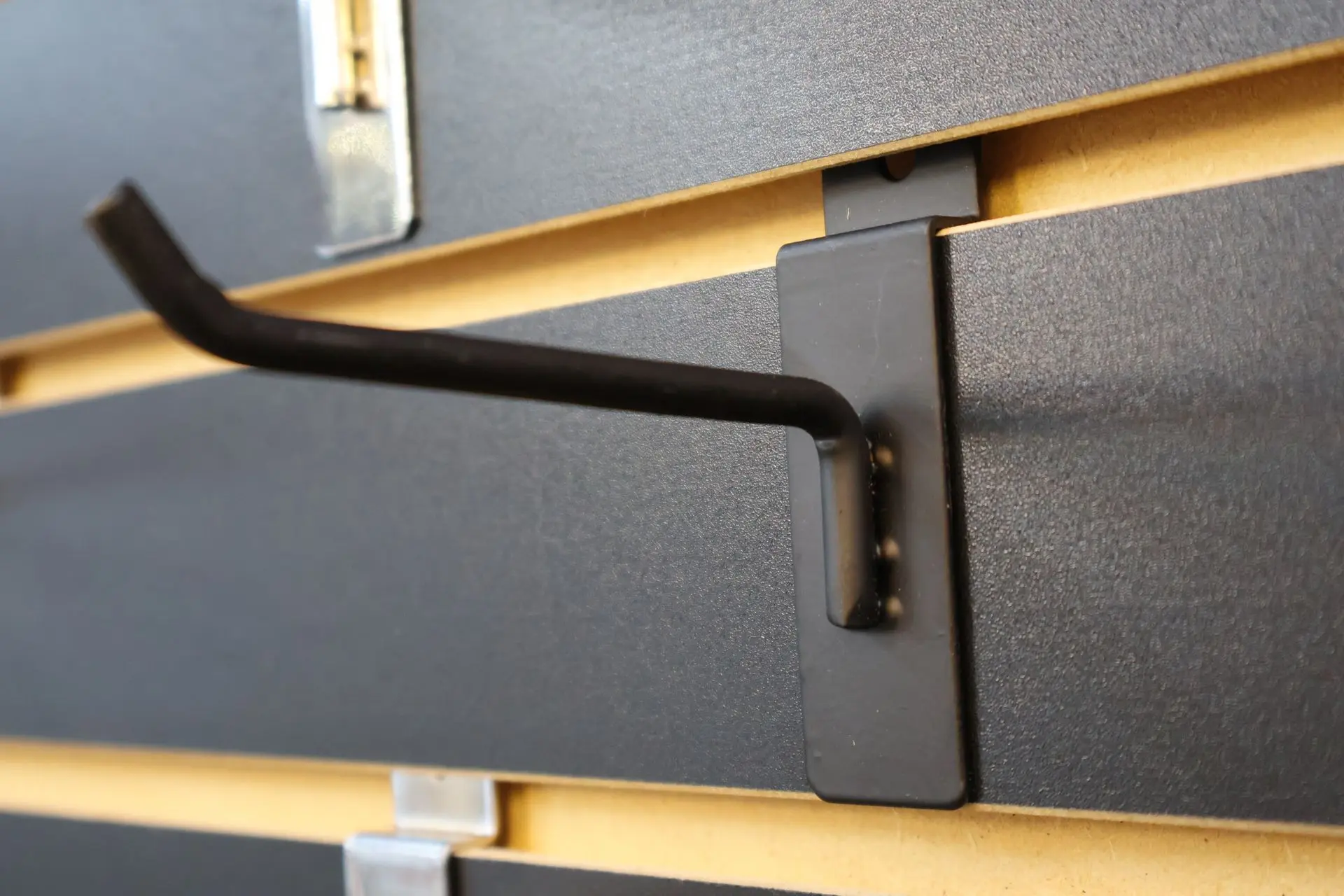 Durable metal slatwall hook designed to securely display merchandise. Easy to install, strong, and ideal for organizing retail products of all sizes.